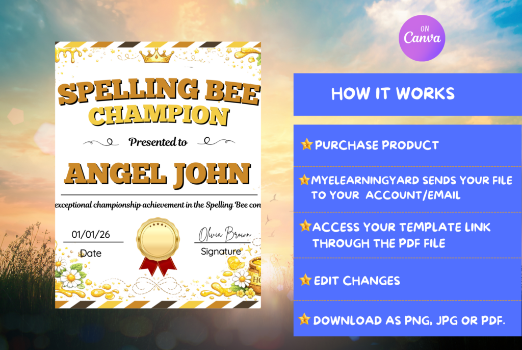 Step into a bright and proud moment of achievement with our “Golden Bee Spelling Champion Certificate” template. This delightful design captures the joyful, celebratory vibe of a big win, bursting with golden energy, fun, and award-winning charm. It’s the perfect choice for honoring classroom heroes, school competitions, spelling bees, or any special milestone for a star student.