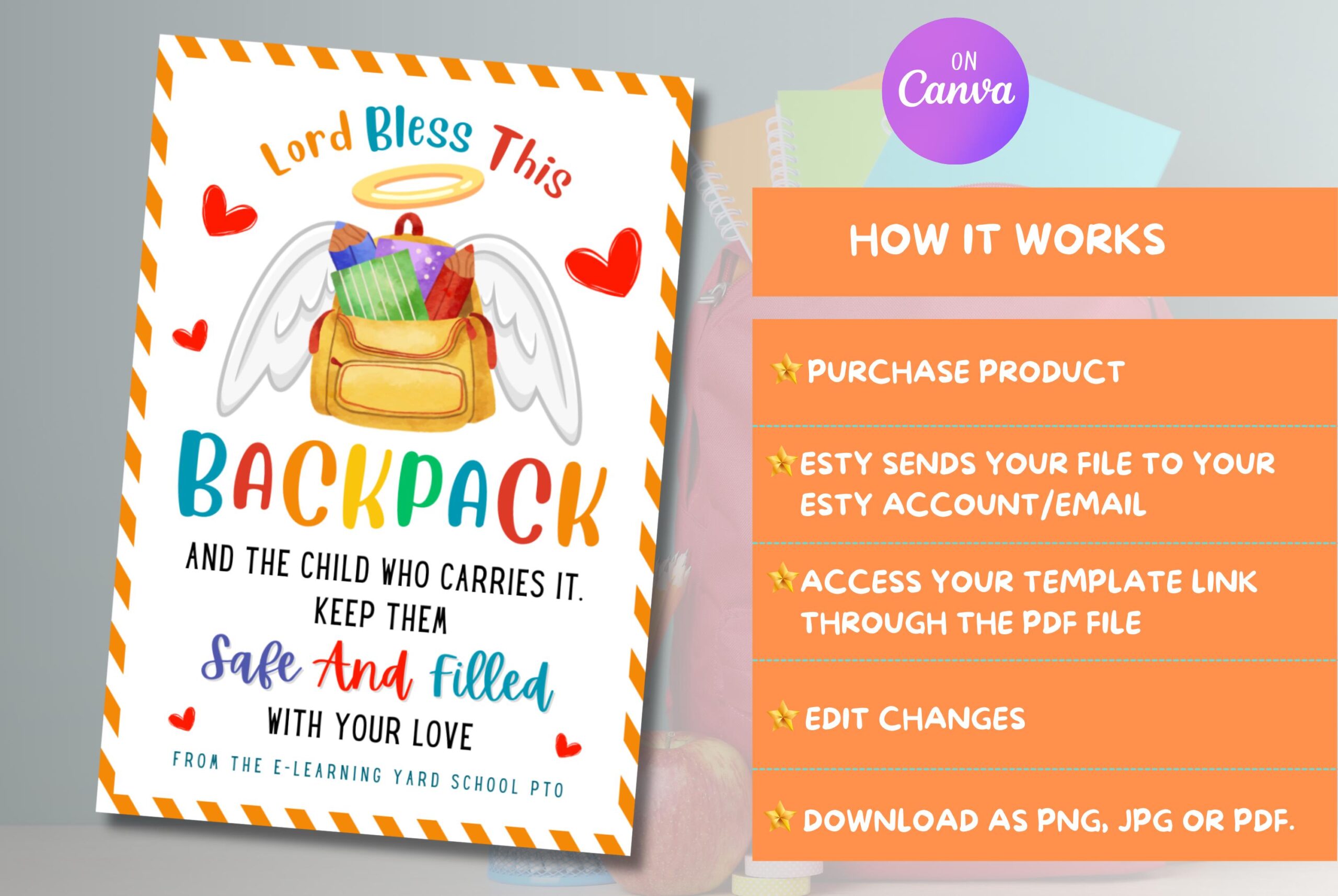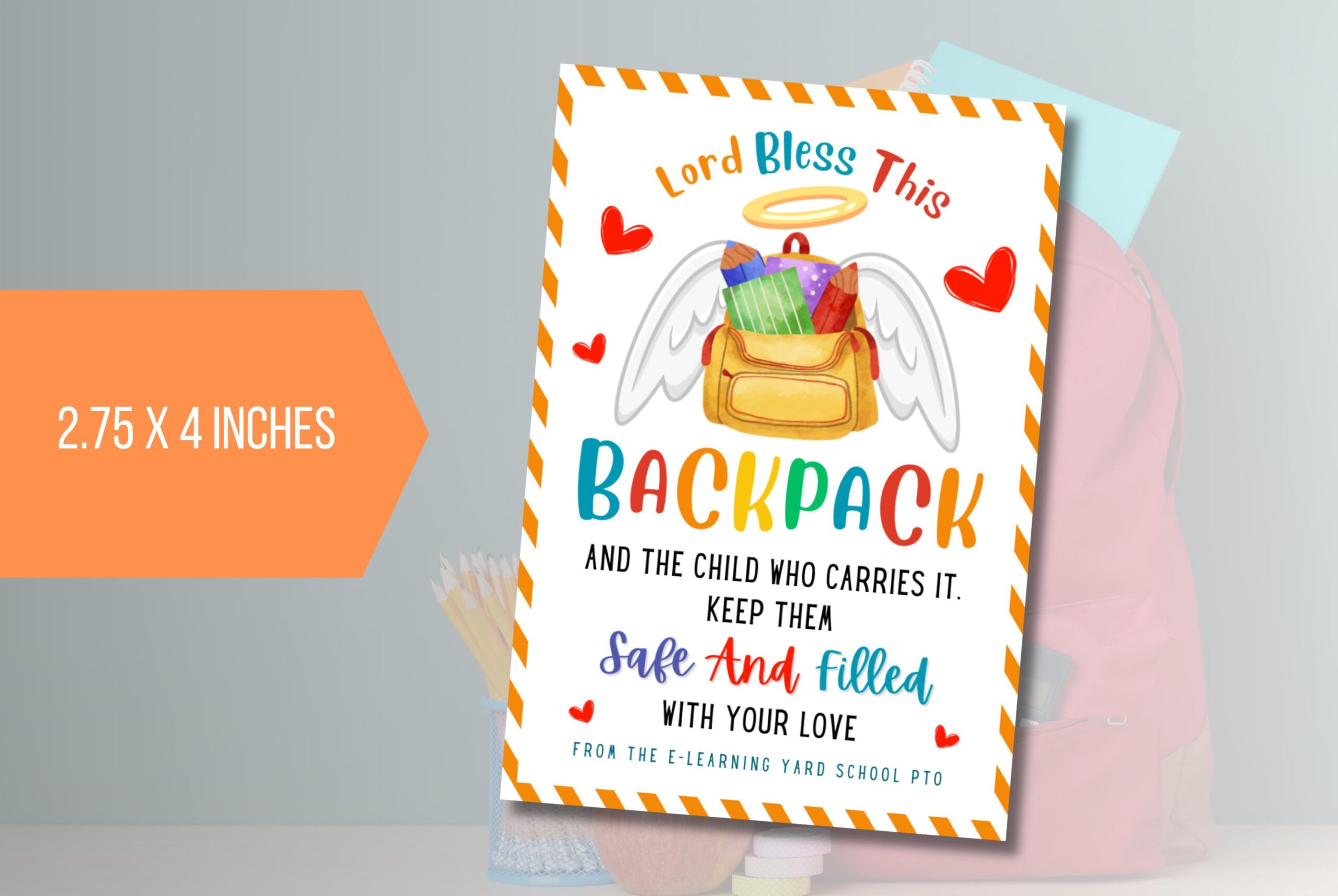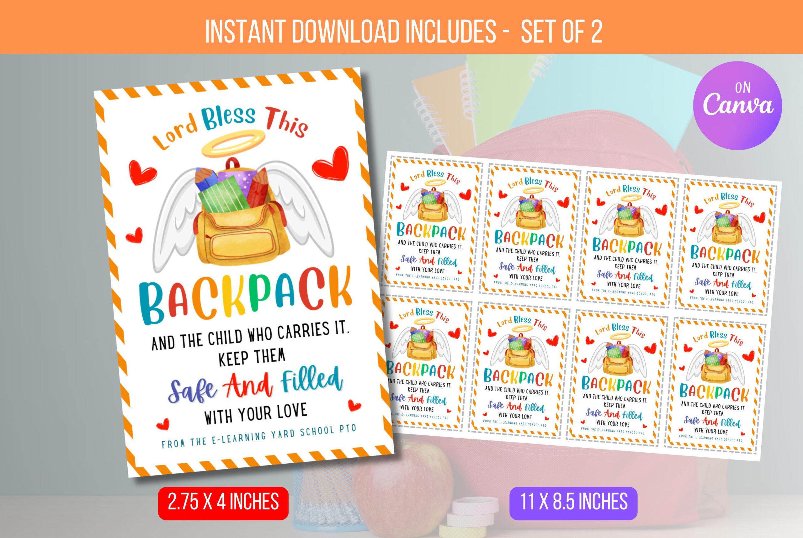 Looking for a perfect way to send your kids back to school with a blessing? This editable “Backpack Blessing” tag bundle features a cute backpack illustration and a touching prayer for protection and guidance. Personalise the tags with your details and attach them to backpacks or lunchboxes to share comfort as they start their new academic adventures using Canva.com.Â