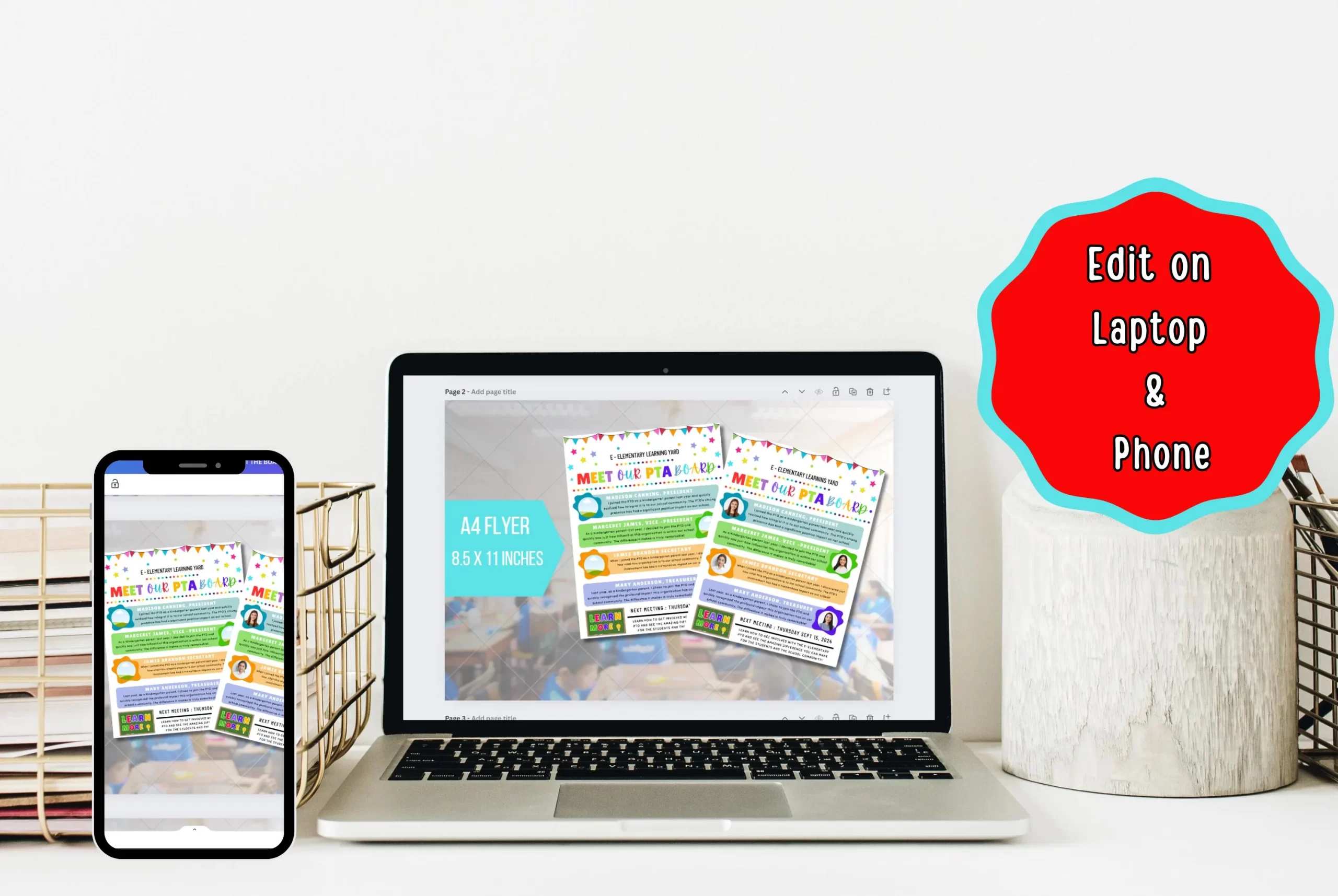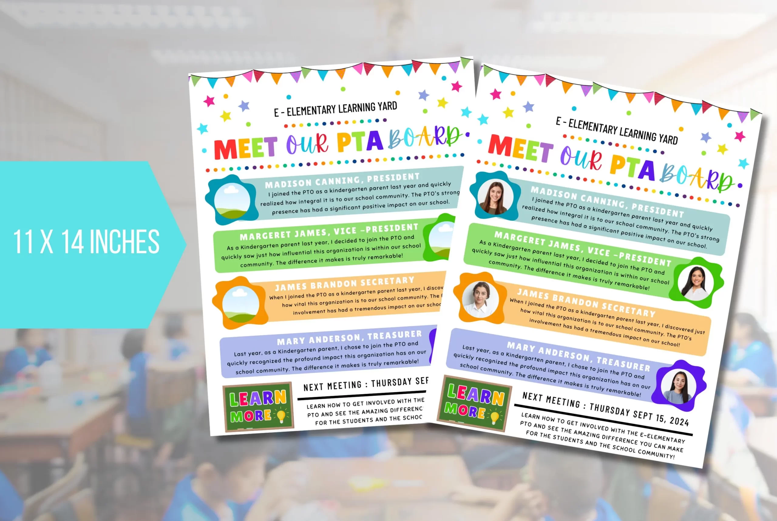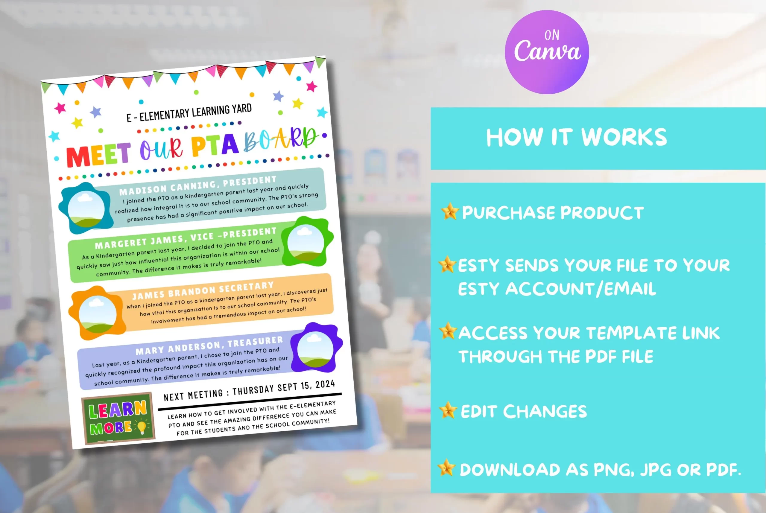Introducing your Parent Teacher Association (PTA) or Parent Teacher Organization (PTO) board members is easy with our editable “Meet Our PTA Board” flyer template! Featuring a colorful design and a clear layout for bios and a “Learn More” section, it’s perfect for sharing key information and inviting new members to your next meeting. Use this template to highlight the dedicated individuals making a difference in your elementary school community using Canva.com.Â