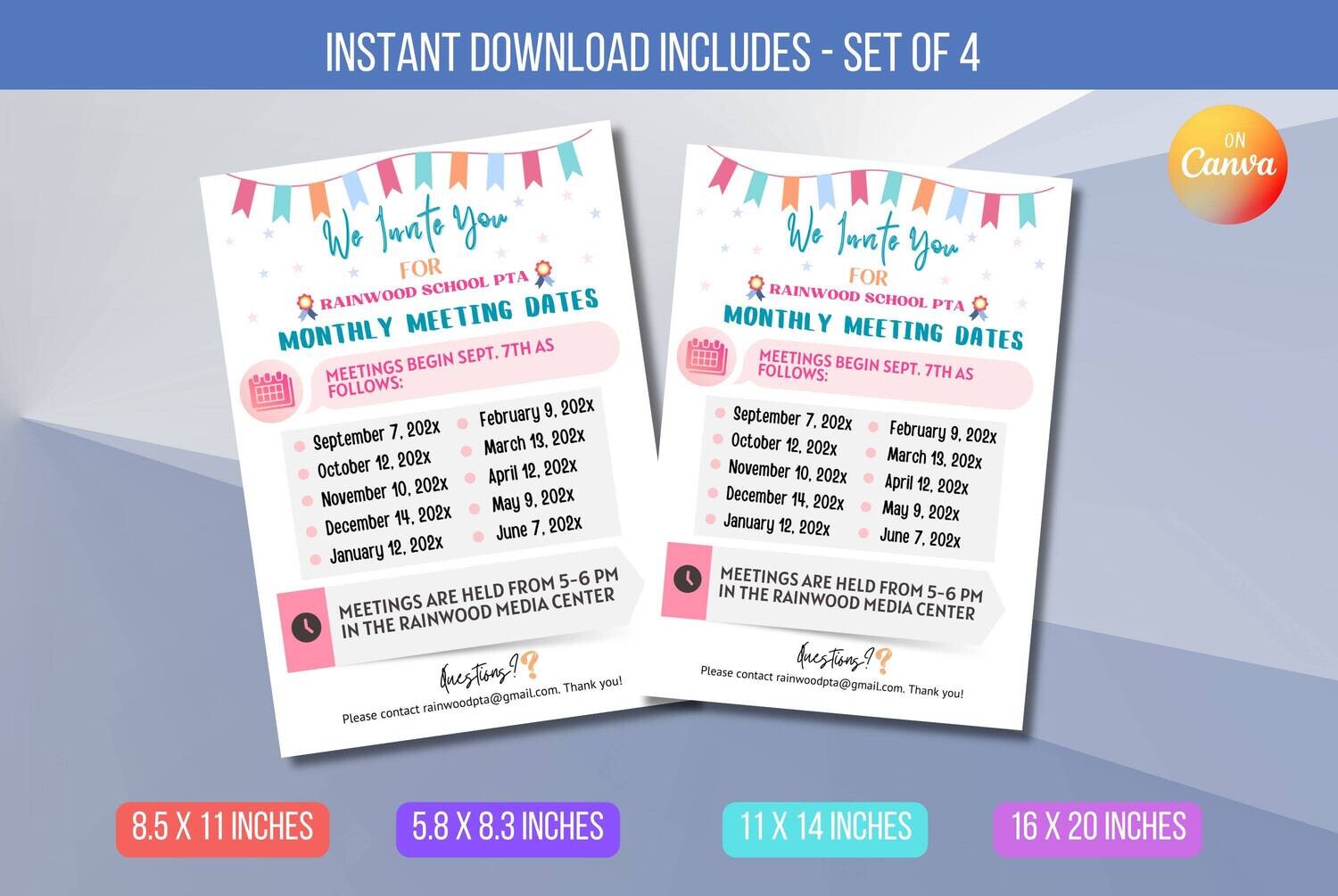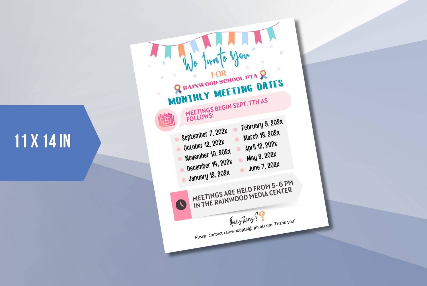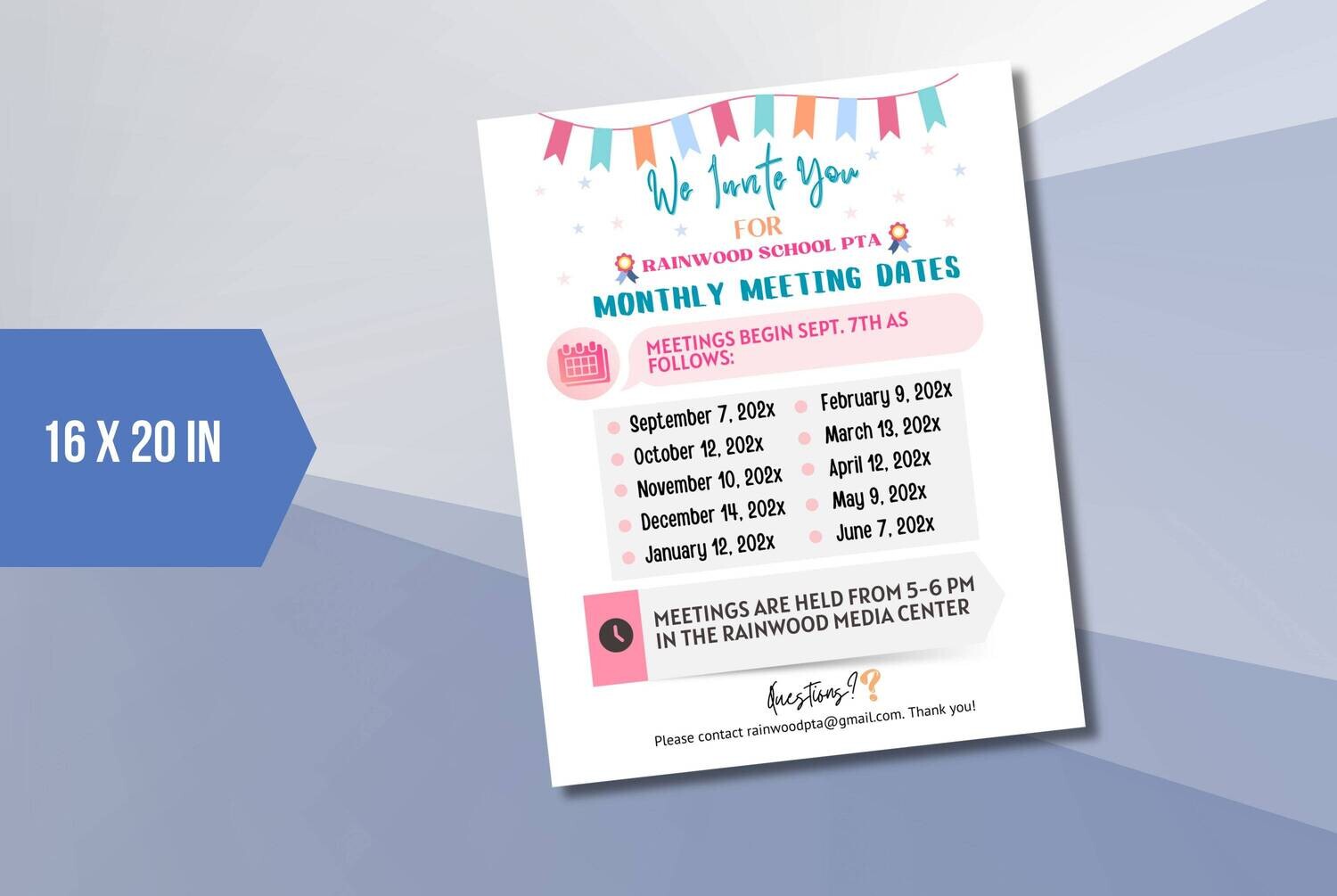 Stay organized and keep your school community informed with this printable “PTA Meeting Dates” flyer template. Featuring a fun pennant banner and a clear monthly schedule with meeting times and locations, it simplifies sharing vital information. Say goodbye to forgotten meetings and hello to effective communication and community engagement using Canva.com