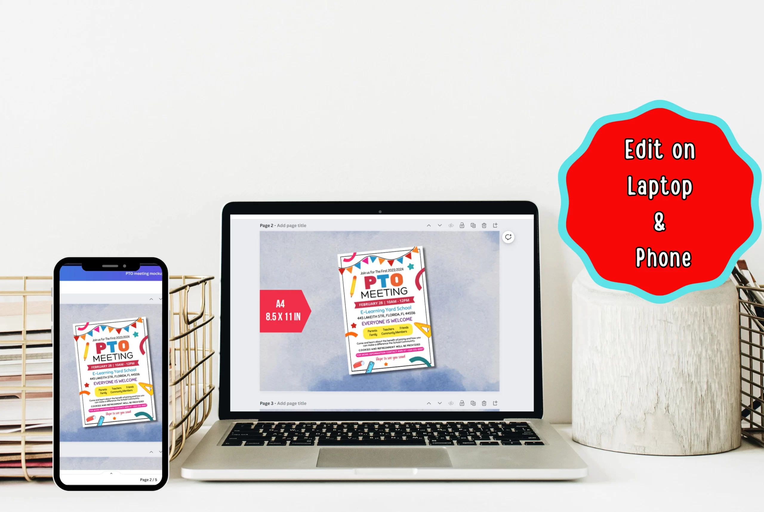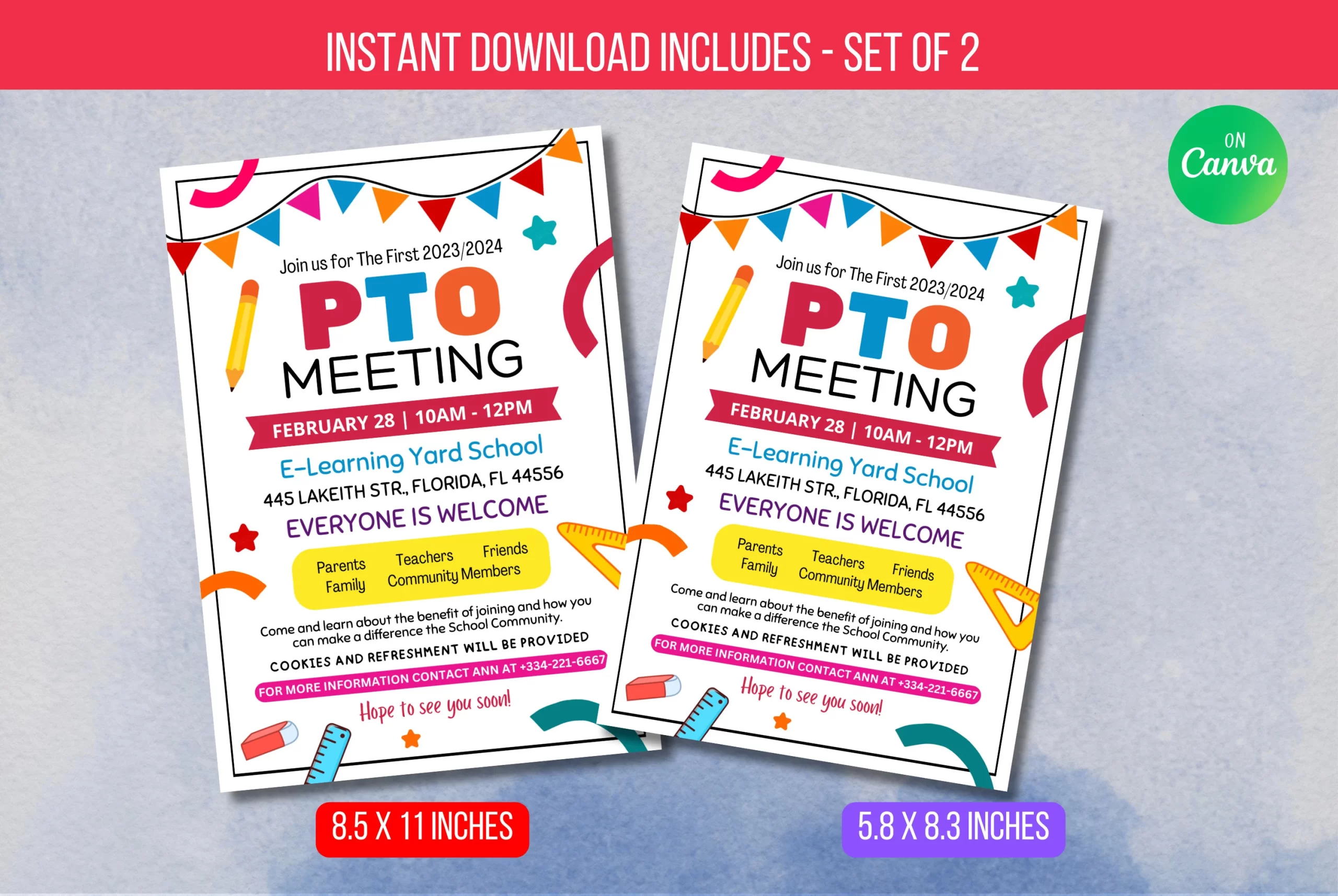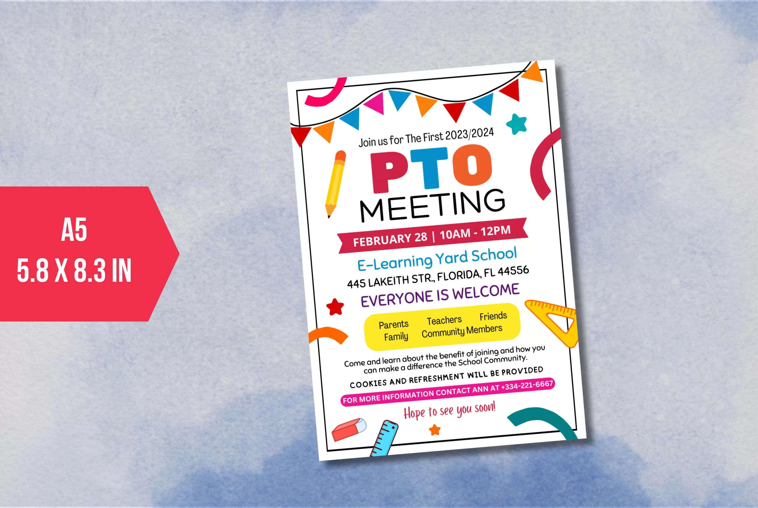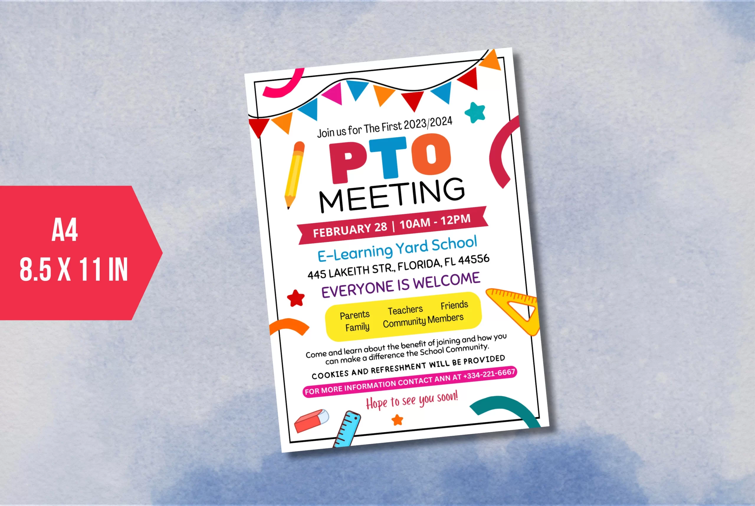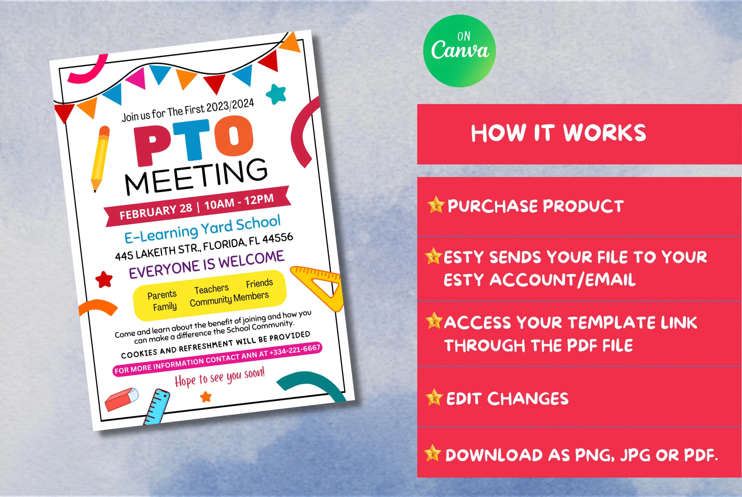 Boost attendance at your next PTO meeting with this editable PTA Meeting Handout flyer. Featuring fun school supply illustrations, it presents meeting details such as date, time, and location at E-Learning Yard School, along with an inclusive welcome message. Highlight the benefits of joining and the promise of cookies and refreshments. Use this engaging template to inspire parents, teachers, and community members to participate and make a difference using Canva.com