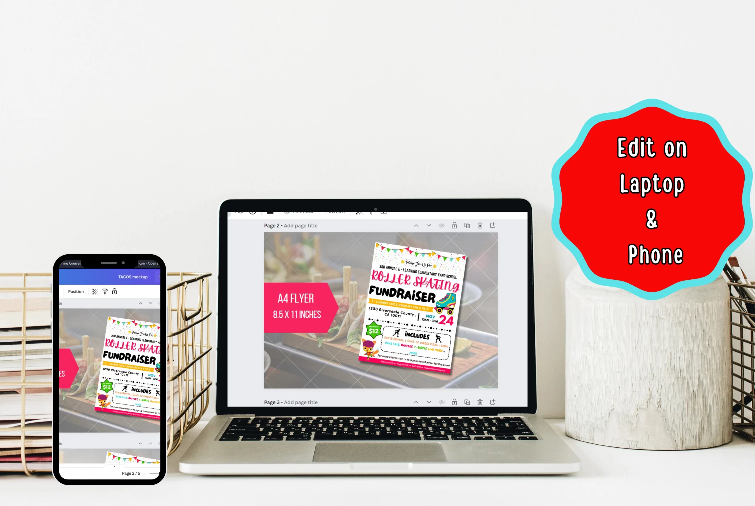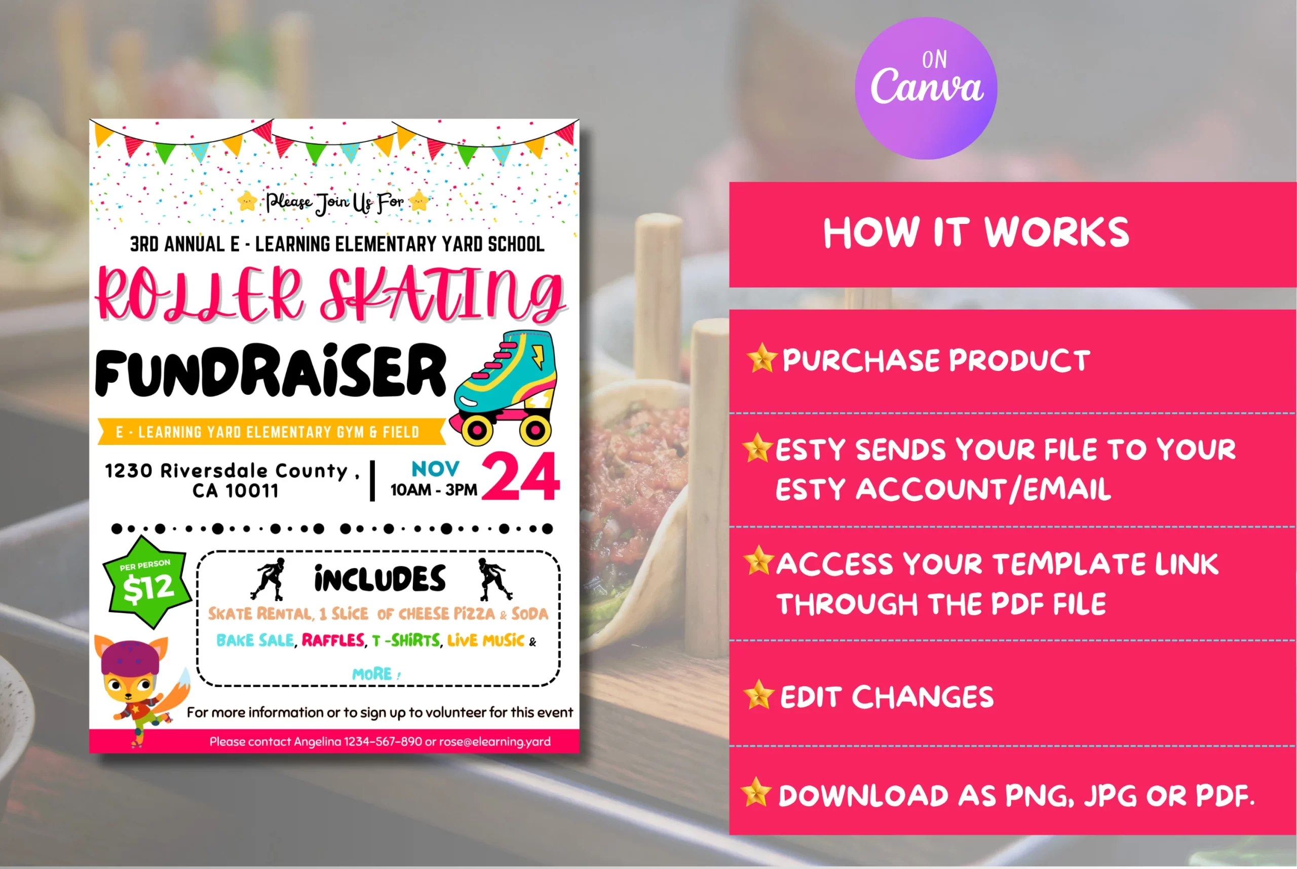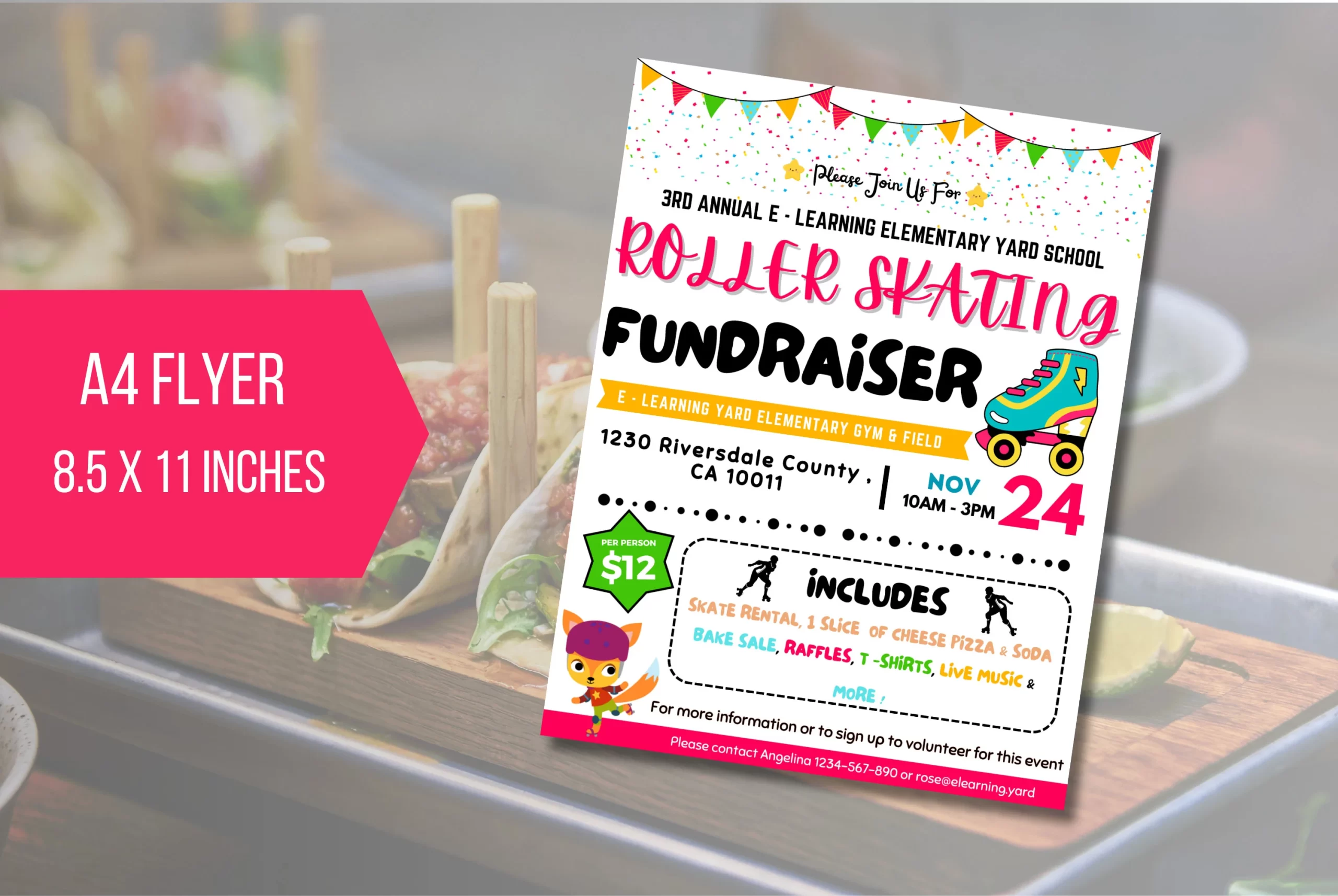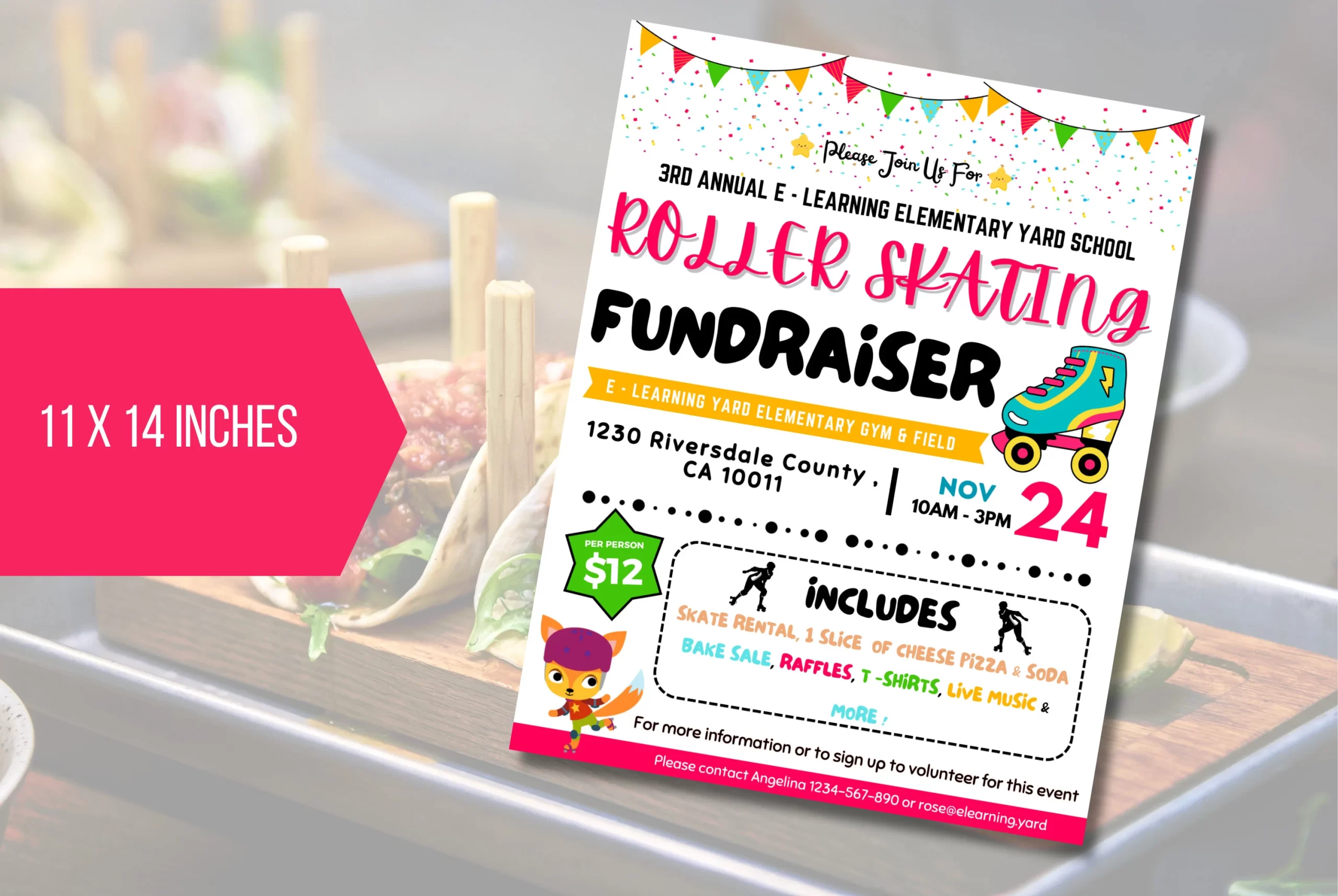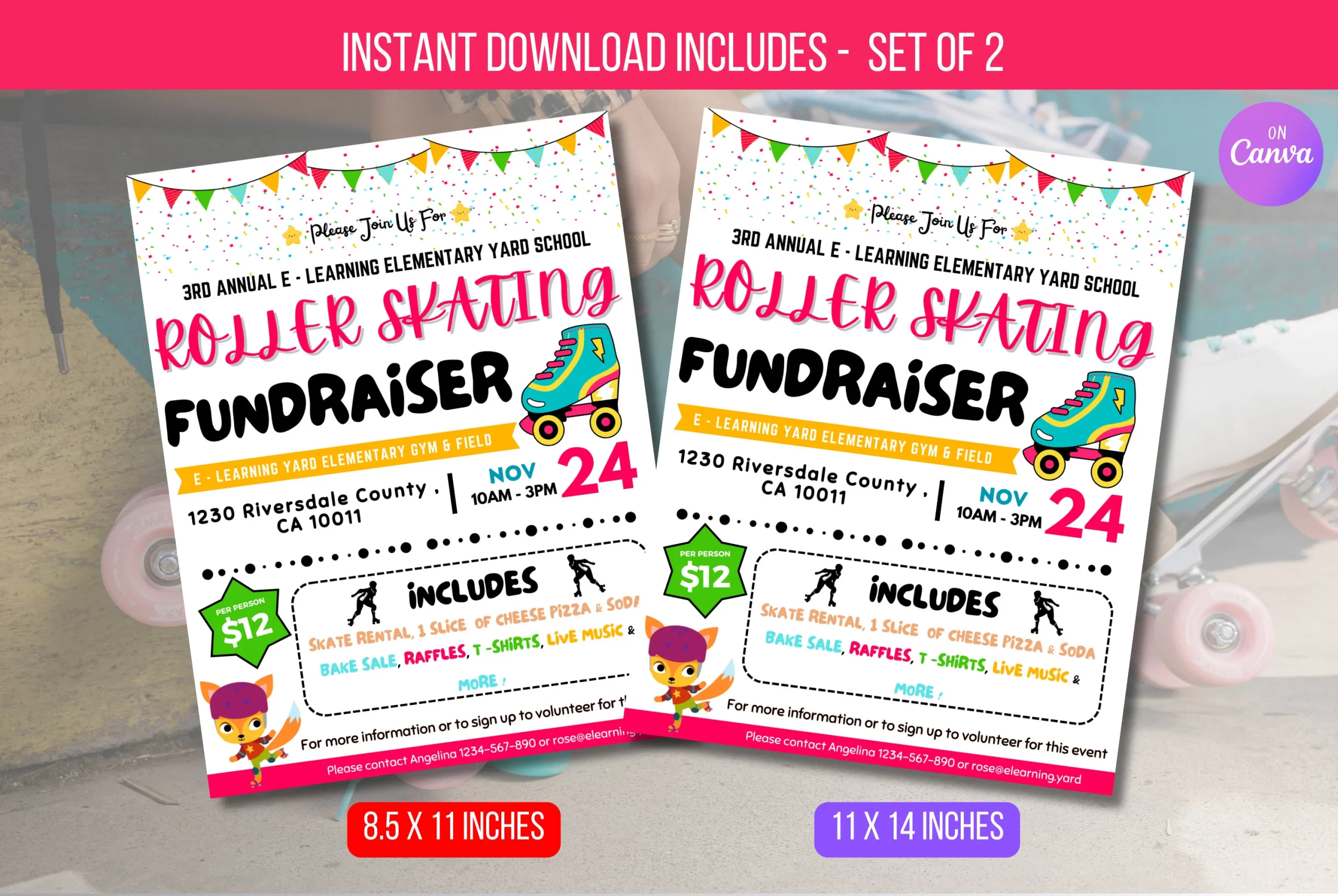 Get ready to fundraise with our cheerful Editable Roller Skating Fundraiser flyer! Perfect for your school event, this fun flyer features a playful roller skate design and transparent pricing for skate rentals, pizza, soda, and more. Customise the date, time, and contact details to make your fundraiser a hit! Enjoy the ride! using Canva.com