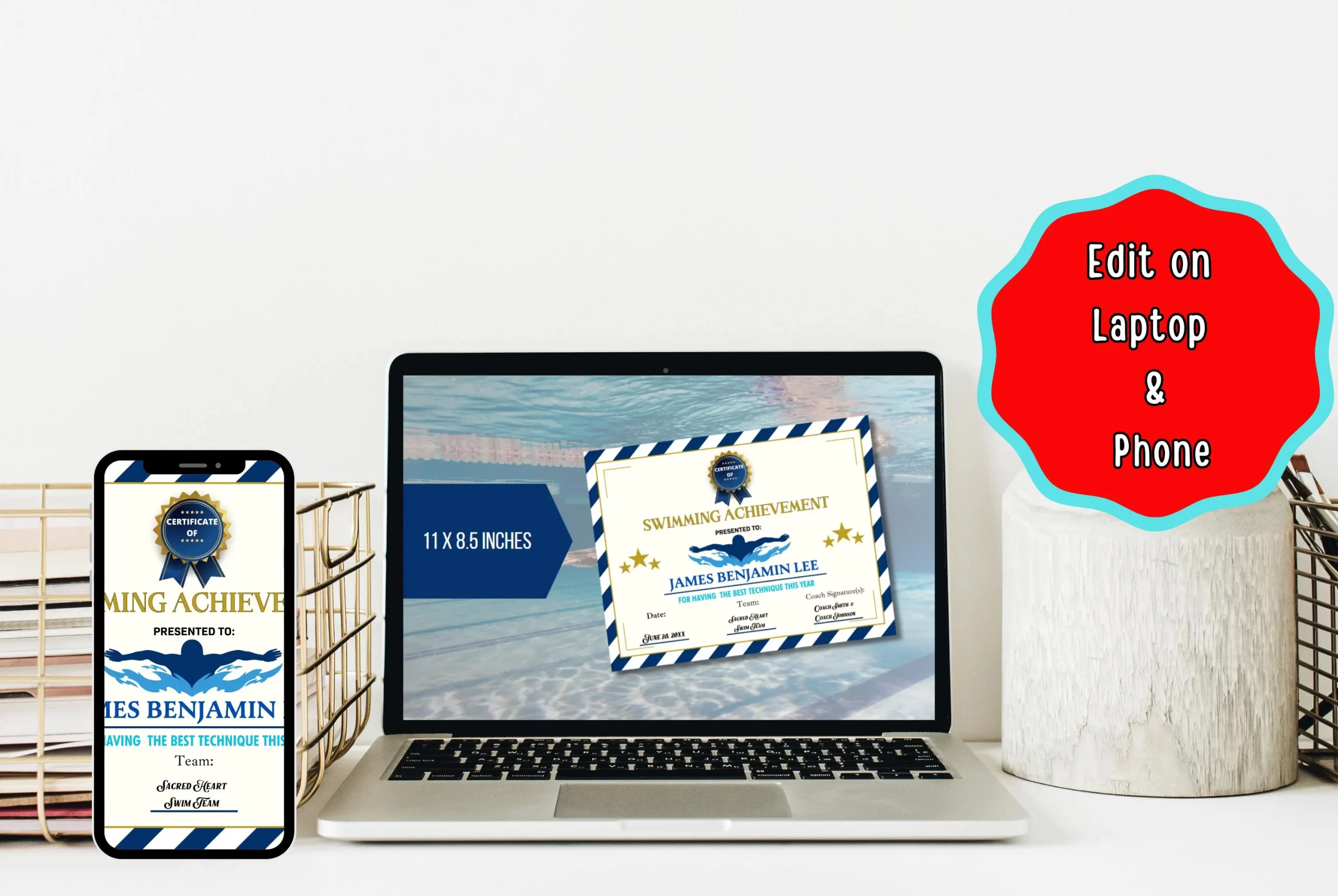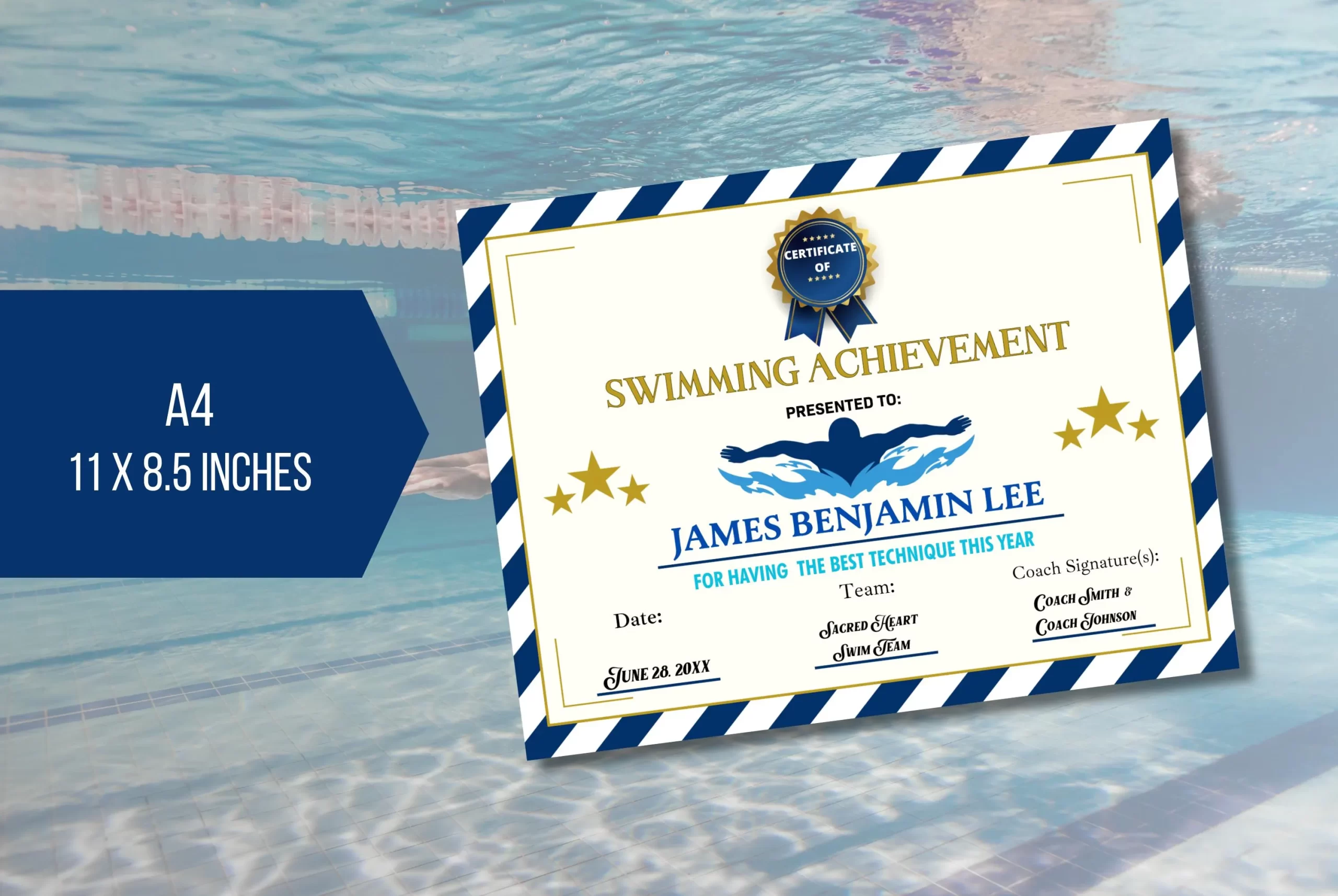 Celebrate aquatic achievements with our fun, customizable swimming award certificates! Their vibrant design is perfect for recognizing milestones in the pool. Just add the swimmer’s name, their achievement and the date to make it special using Canva.com. These awards are great for swim schools, summer camps, and proud parents, making every little swimmer feel like a champion! Try editing using this free trial template.