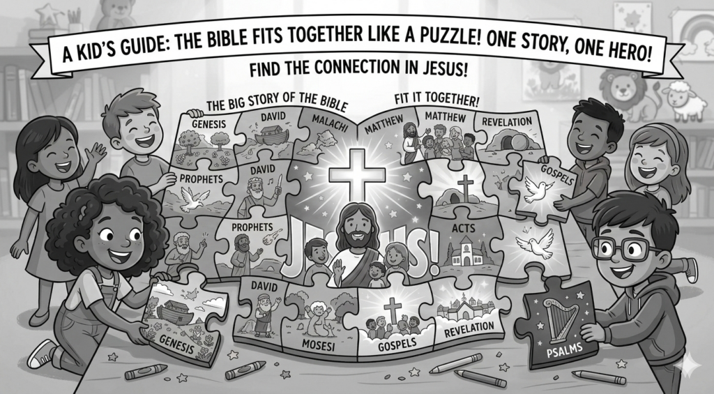 Imagine the Bible as a 66-piece puzzle that becomes one piece once assembled. Even though the Bible pieces were written by many different people over a long, long time, when you snap them all together, they make one big, beautiful picture of Jesus.